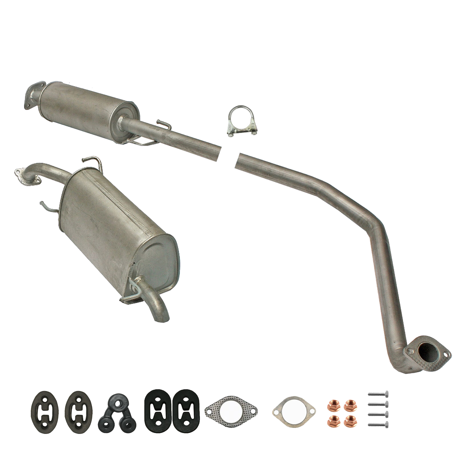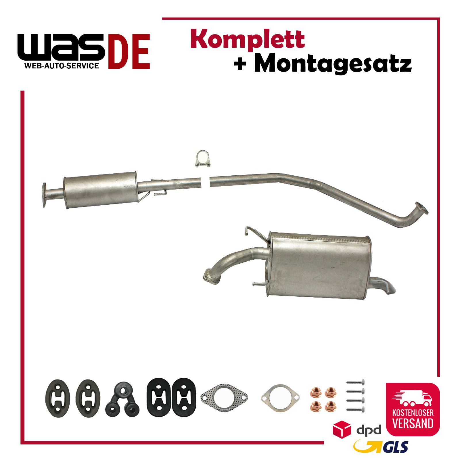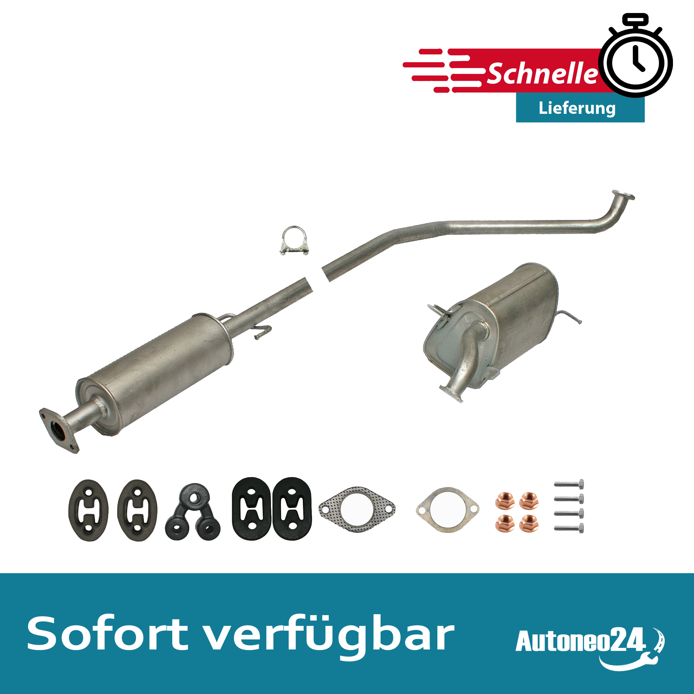 Auspuff, Auspuffanlage, Mittelschalldämpfer, MSD, Endschalldämpfer, ESD, Schalldämpfer, Montagesatz, Montageteile, Abgasanlage, Anbaukit