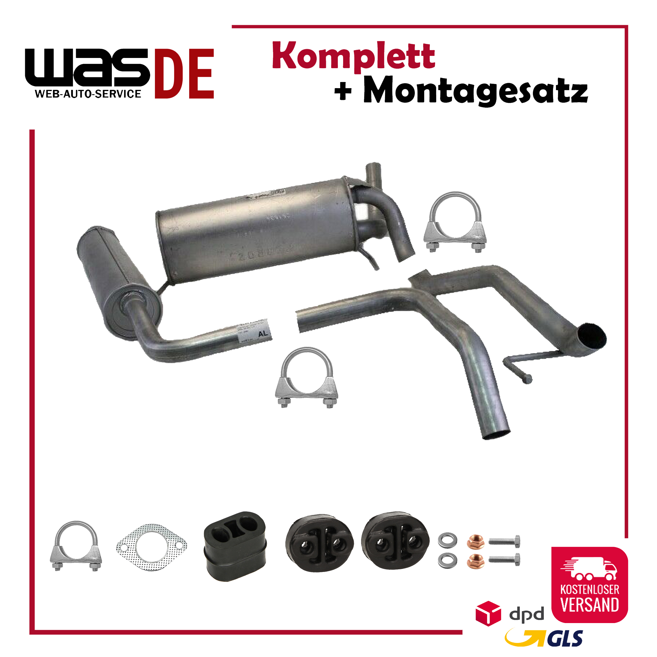 Auspuff, Auspuffanlage, Mittelschalldämpfer, MSD, Endschalldämpfer, ESD, Nachschalldämpfer, Schalldämpfer, Montagesatz, Montageteile, Abgasanlage, Anbaukit