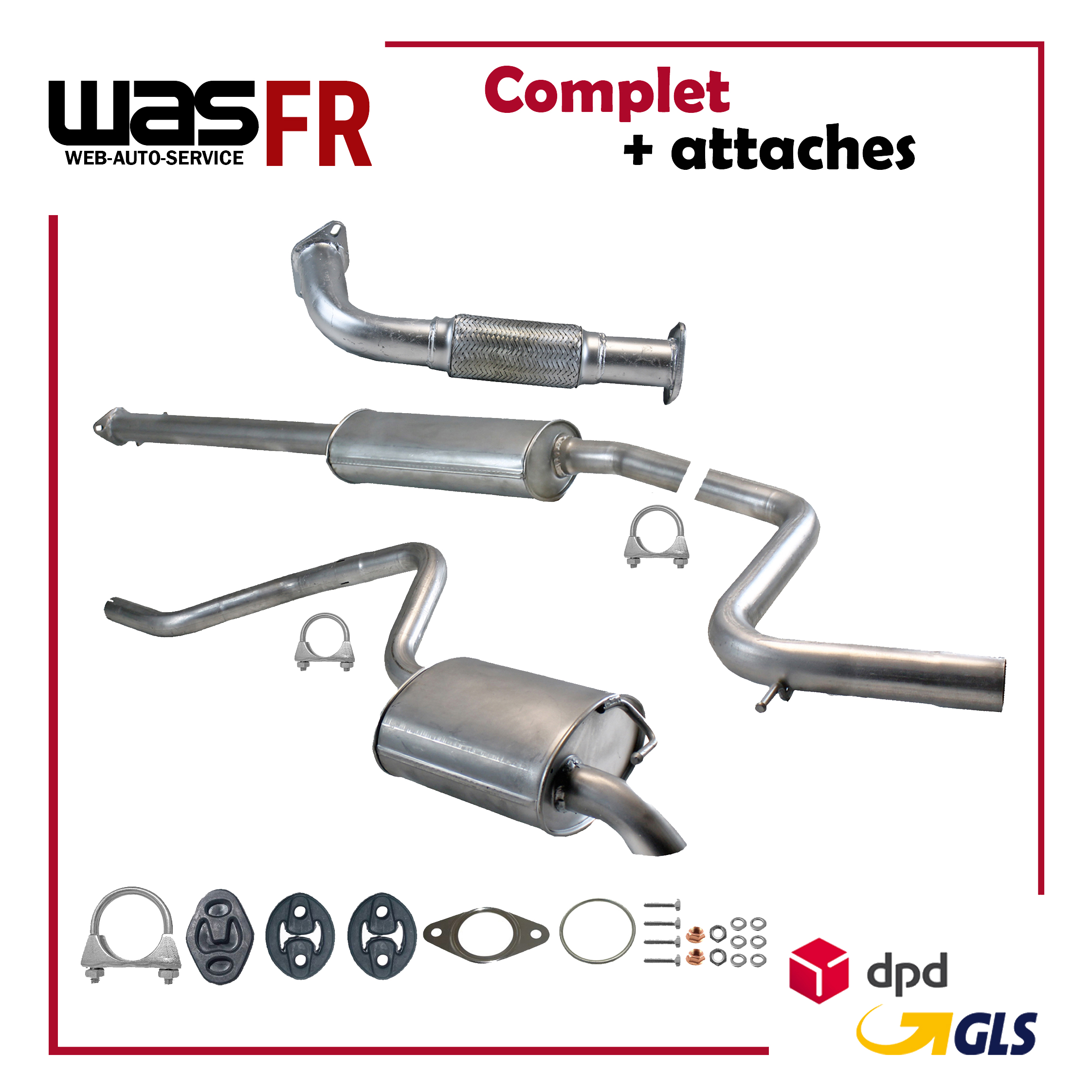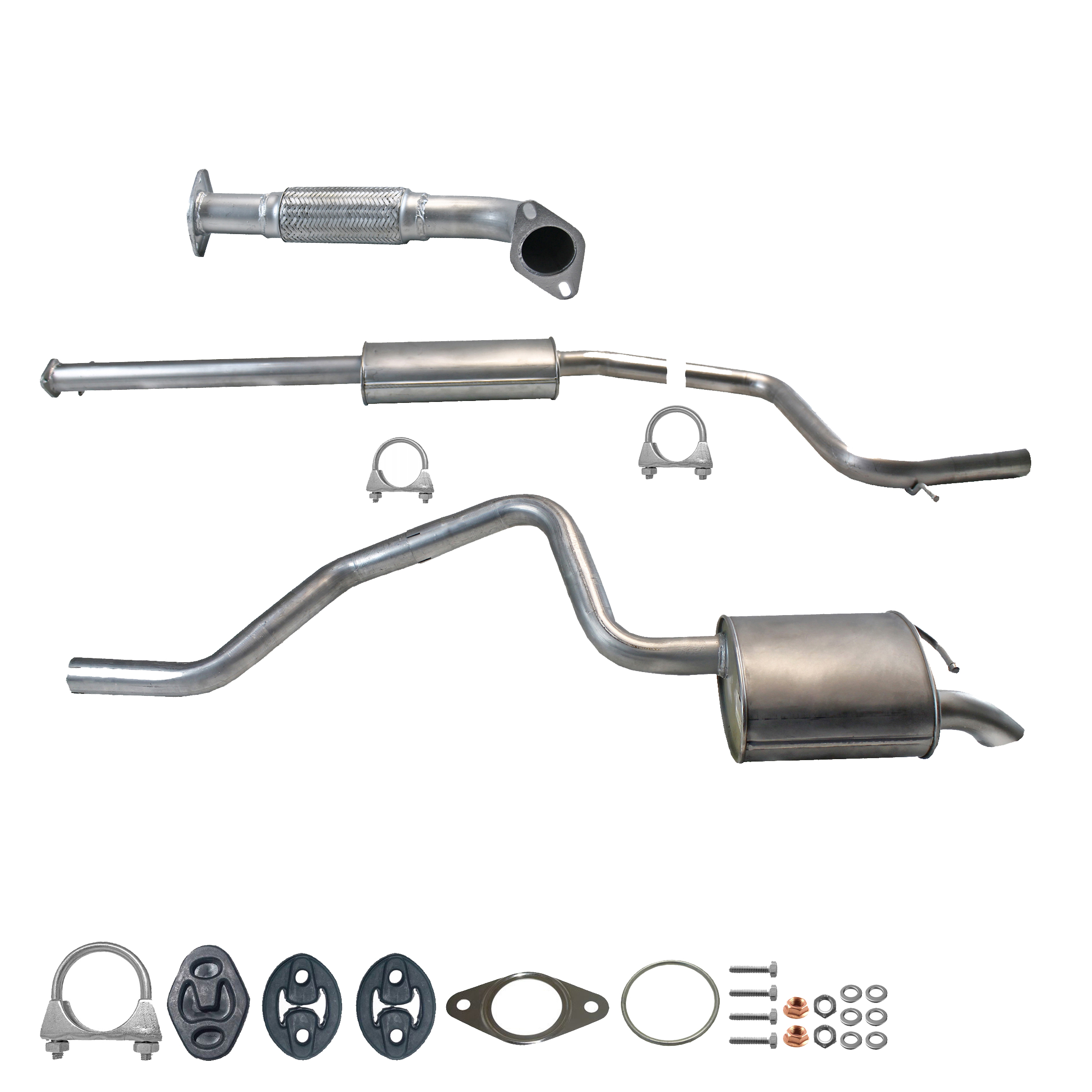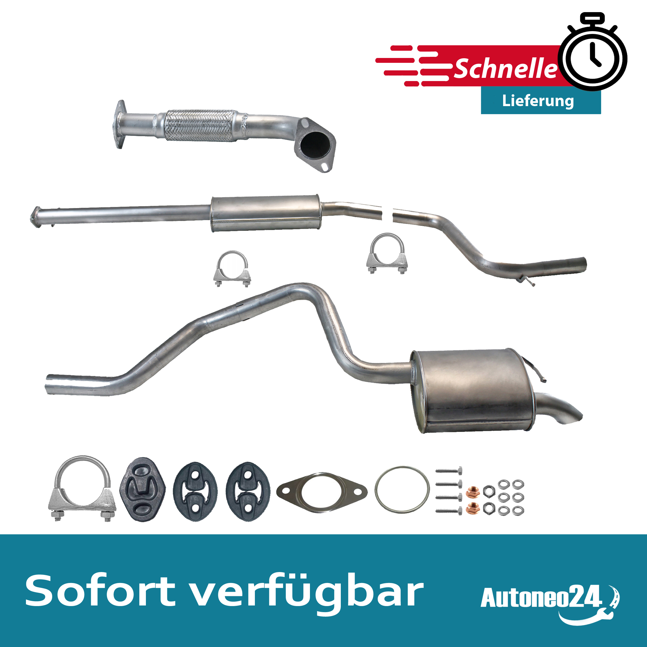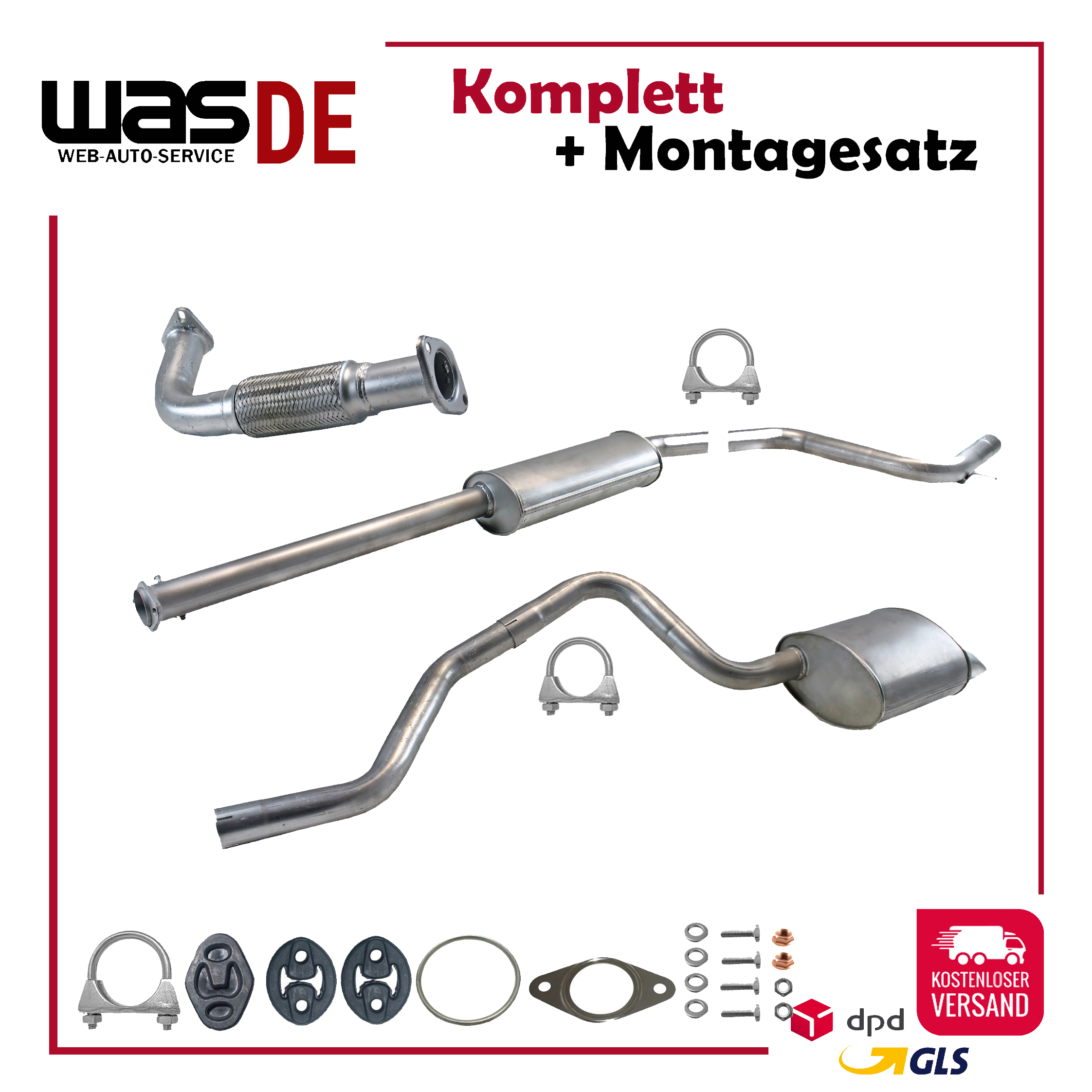 Auspuff, Auspuffanlage, Mittelschalldämpfer, MSD, Endschalldämpfer, ESD, Nachschalldämpfer, Schalldämpfer, Montagesatz, Montageteile, Abgasanlage, Anbaukit