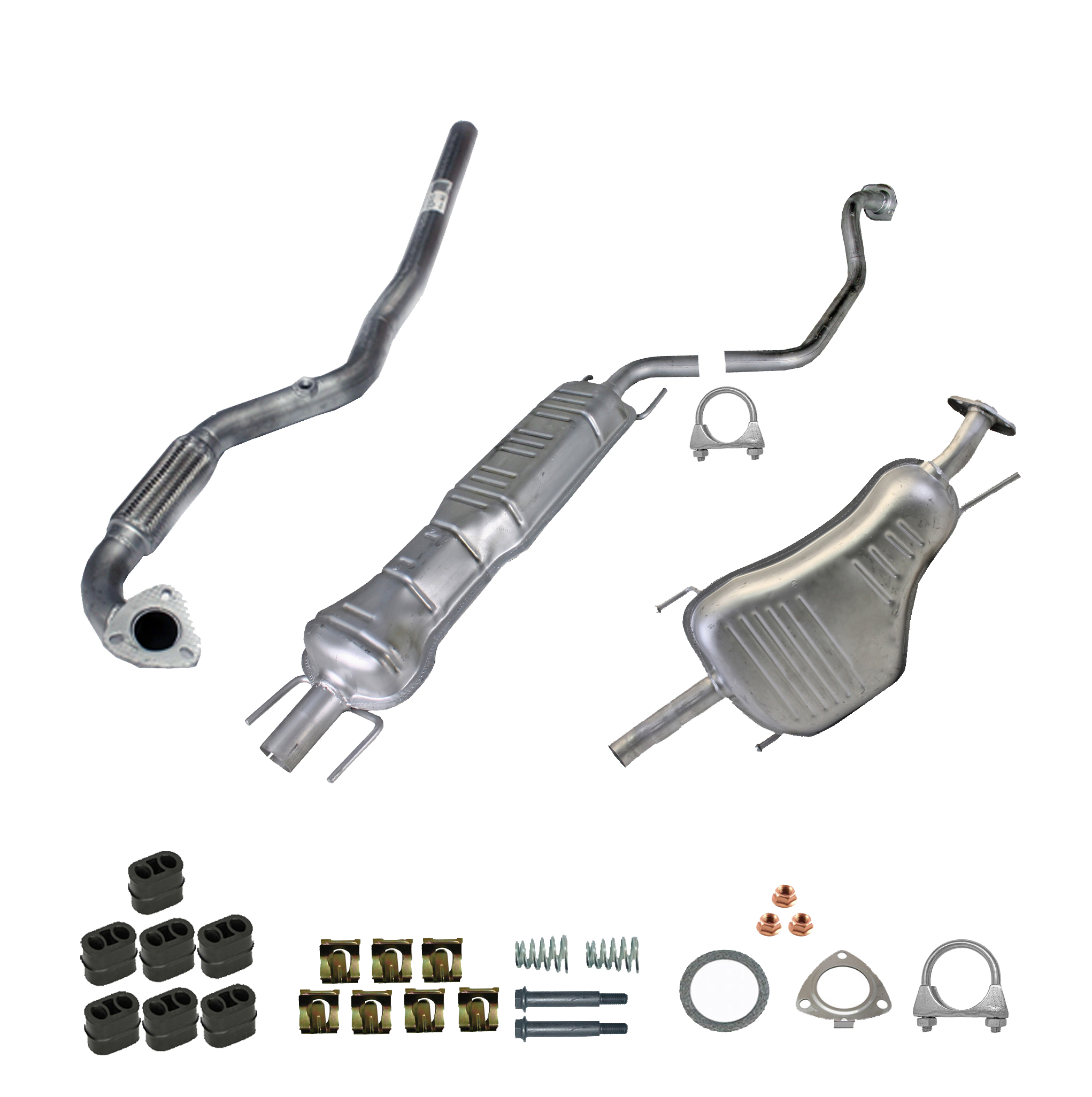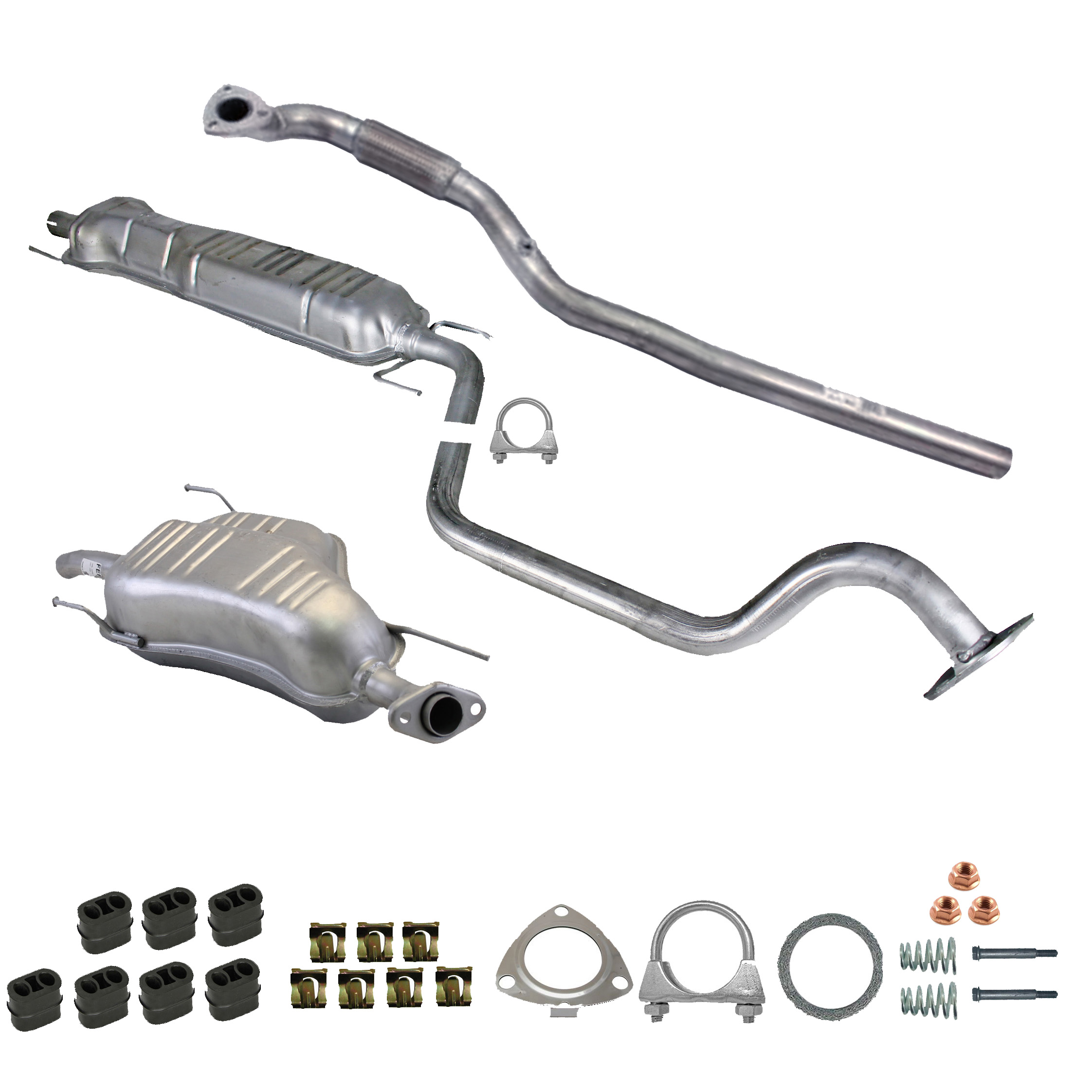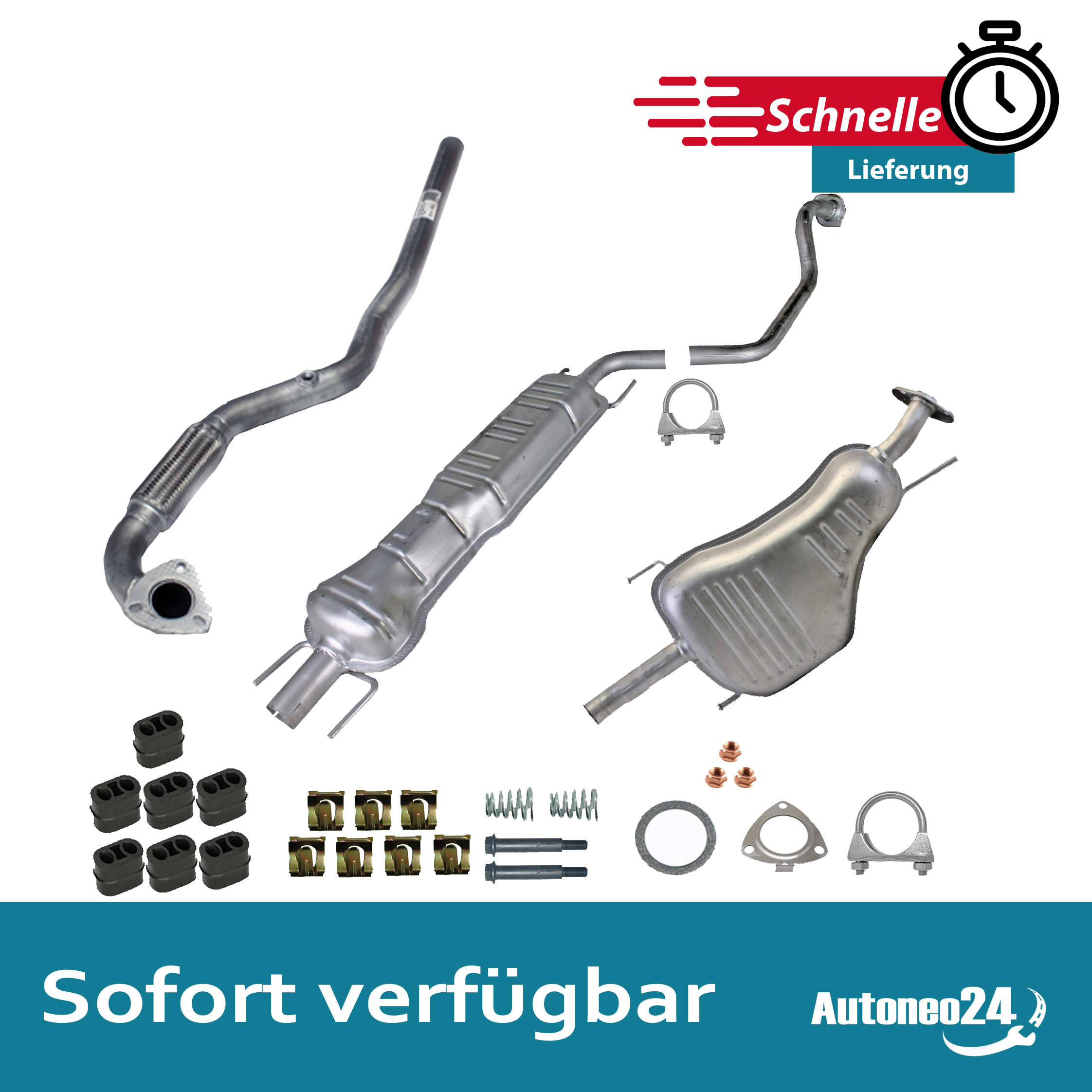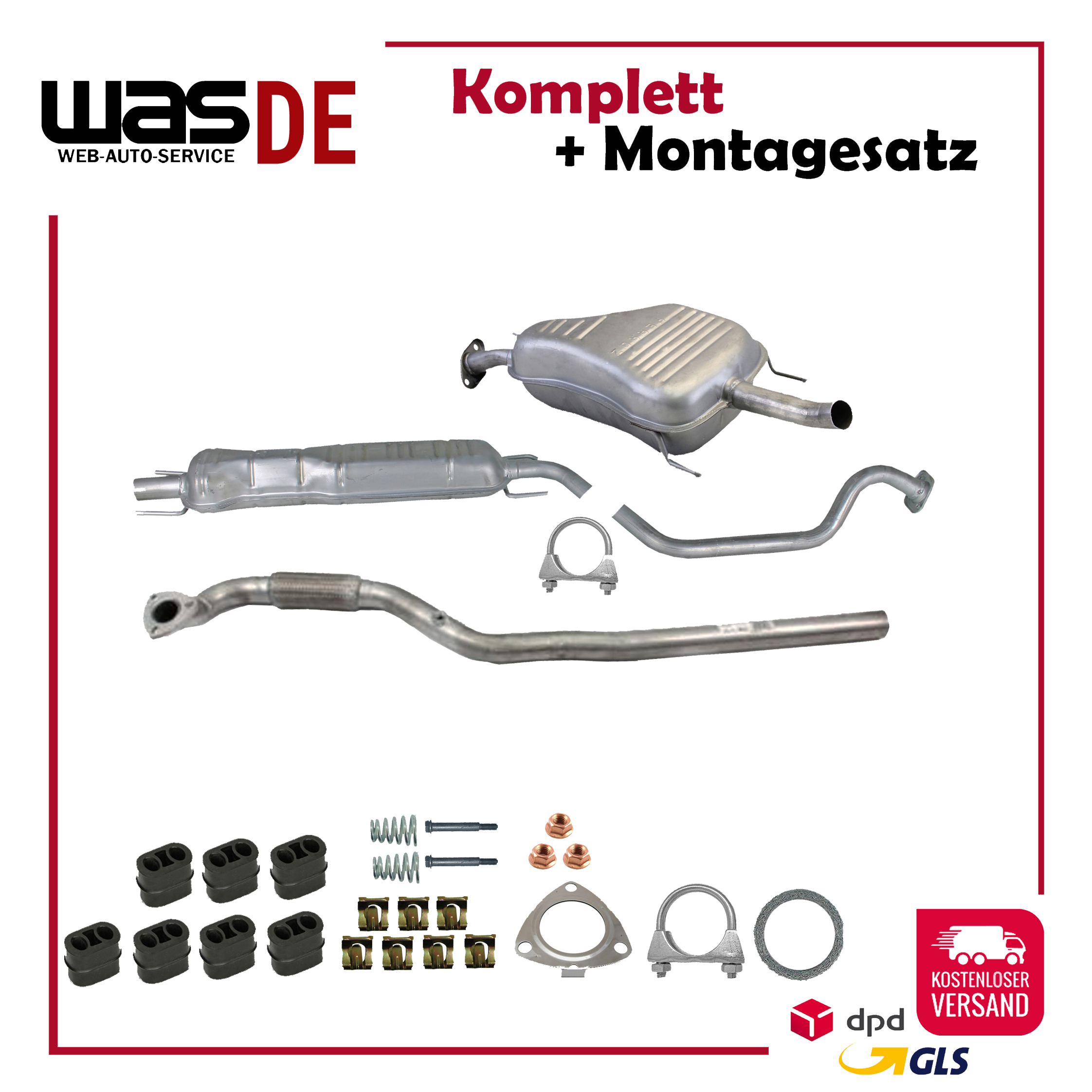 Auspuff, Auspuffanlage, Mittelschalldämpfer, MSD, Endschalldämpfer, ESD, Nachschalldämpfer, Schalldämpfer, Montagesatz, Montageteile, Abgasanlage, Anbaukit