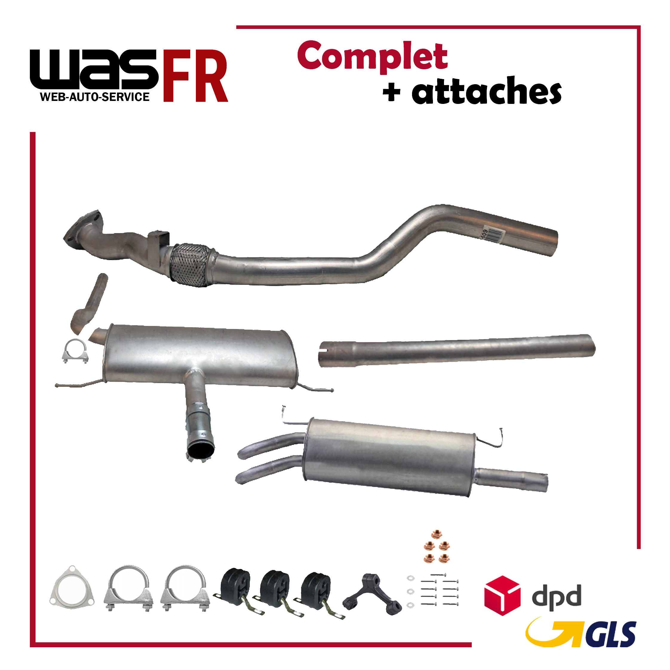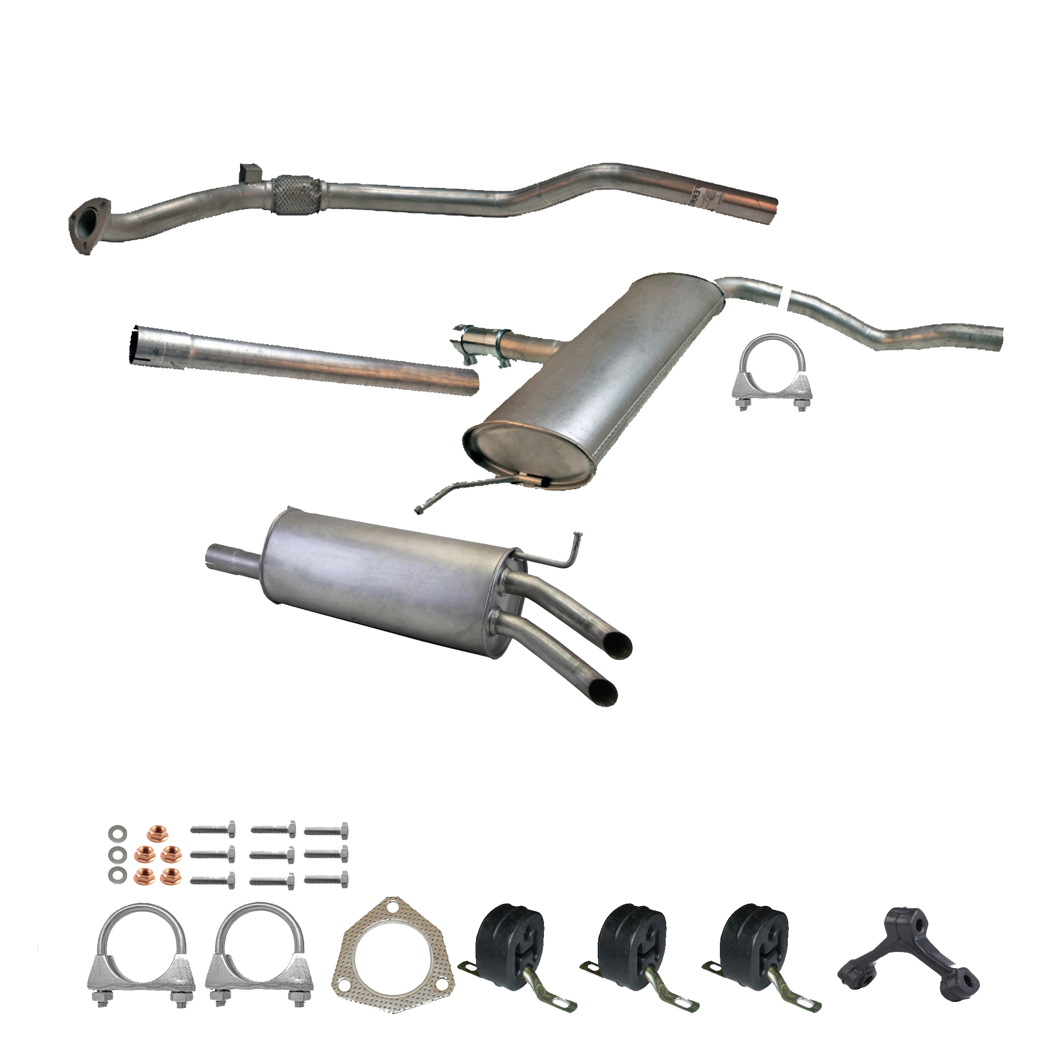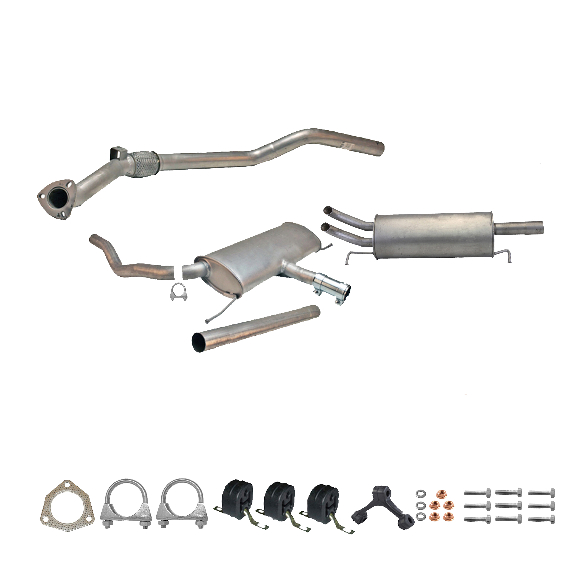 Auspuff, Auspuffanlage, Mittelschalldämpfer, MSD, Endschalldämpfer, ESD, Nachschalldämpfer, Schalldämpfer, Montagesatz, Montageteile, Abgasanlage, Anbaukit
